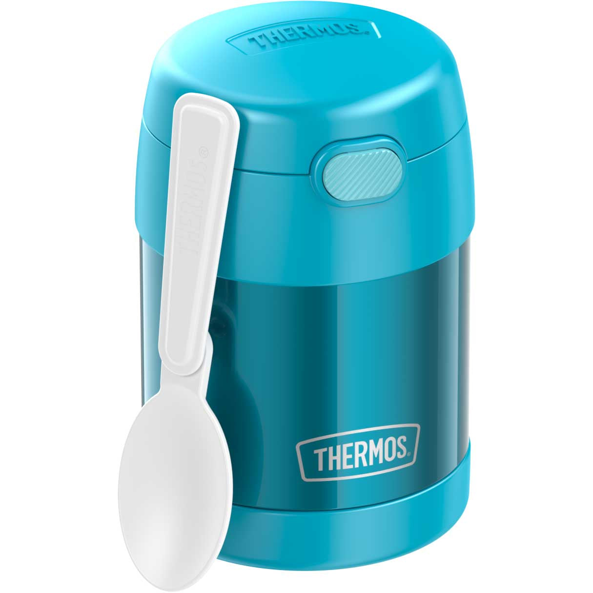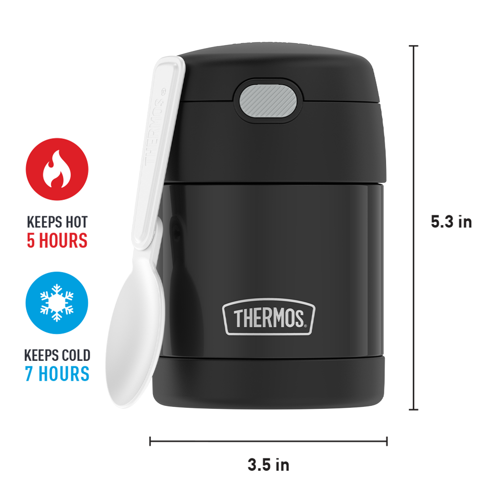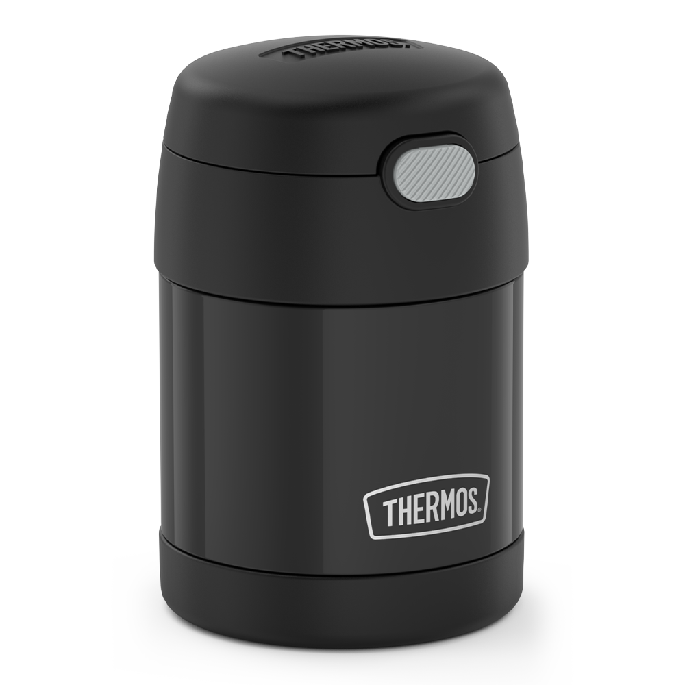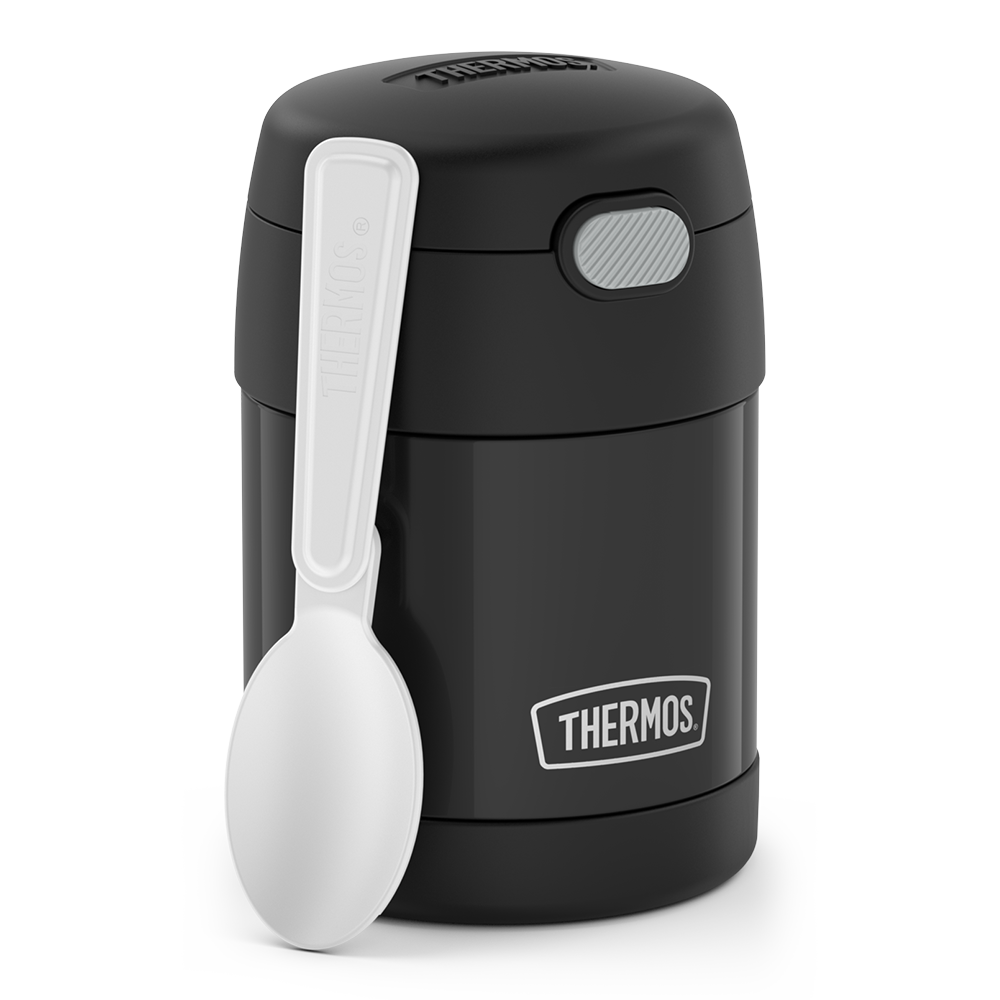 The 10oz FUNtainer? Food Jar from Thermos? brand is vacuum insulated to keep hot foods hot and cold foods cold-and since it’s designed for kids it’s also colorful and fun. Send them to school with their favorite soup so they can enjoy it fresh and hot at lunch time. If they’re in the mood for a cold snack. pack it up with yogurt and berries. or apples and peanut butter. The FUNtainer food jar is light weight and compact with a push button lid so it’s easy to carry and open. To clean. you can pop your FUNtainer food jar in the dishwasher; however washing by hand is recommended. Spoon included. Customize your FUNtainer food jar with adhesive name labels that can be firmly adhered to any FUNtainer product. Two peel and stick labels are included inside this FUNtainer product. Fun for the kids. and easy for the parents. Just write. peel and stick!