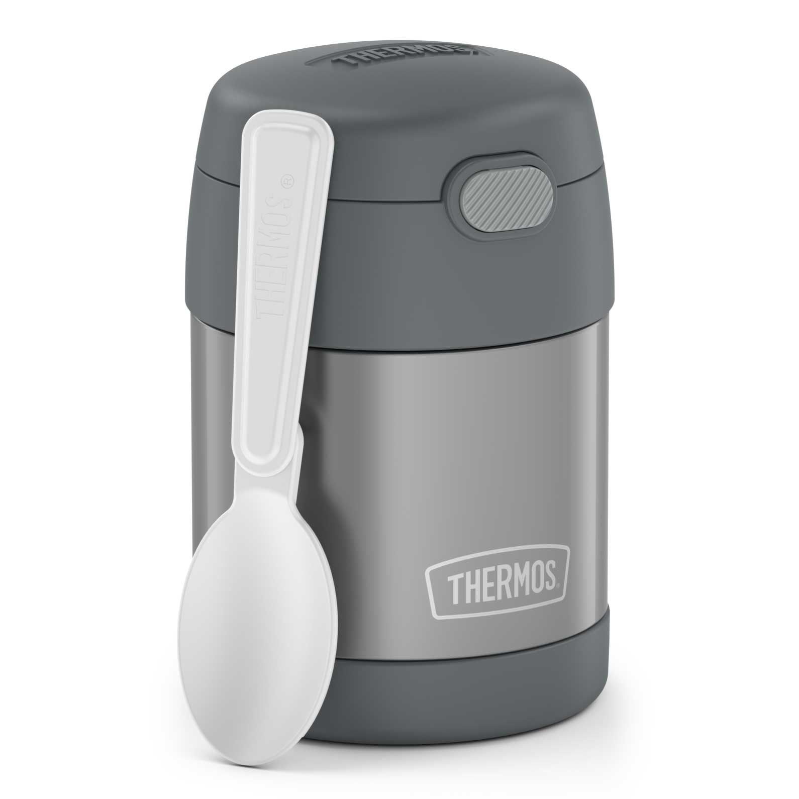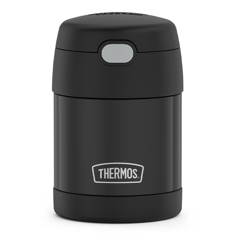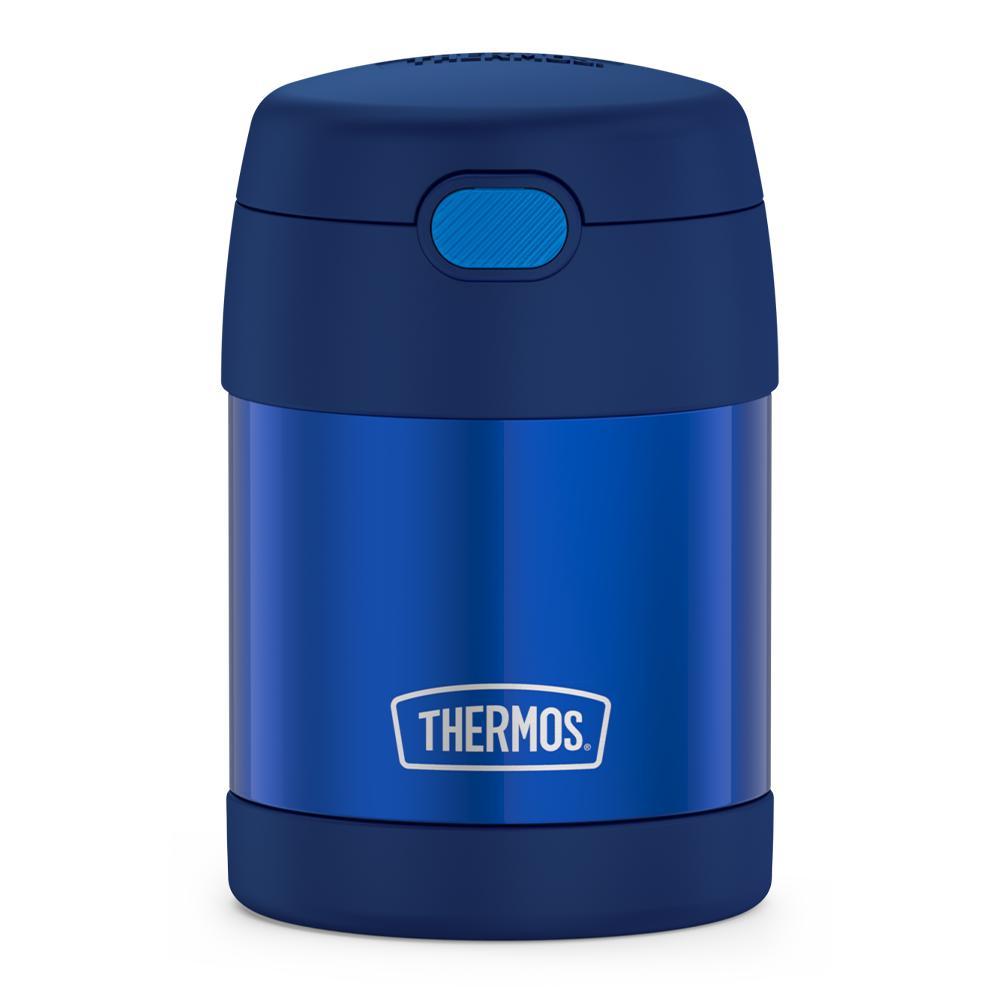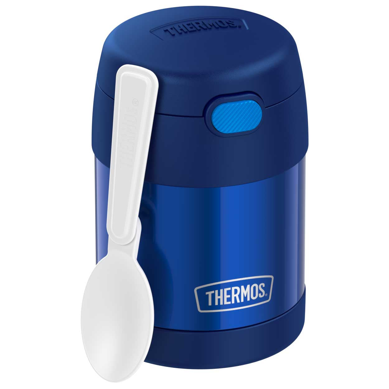The 10oz FUNtainer? Food Jar from Thermos? brand is vacuum insulated to keep hot foods hot and cold foods cold-and since it’s designed for kids it’s also colorful and fun. Send them to school with their favorite soup so they can enjoy it fresh and hot at lunch time. If they’re in the mood for a cold snack. pack it up with yogurt and berries. or apples and peanut butter. The FUNtainer food jar is light weight and compact with a push button lid so it’s easy to carry and open. To clean. you can pop your FUNtainer food jar in the dishwasher; however washing by hand is recommended. Spoon included. Customize your FUNtainer food jar with adhesive name labels that can be firmly adhered to any FUNtainer product. Two peel and stick labels are included inside this FUNtainer product. Fun for the kids. and easy for the parents. Just write. peel and stick!