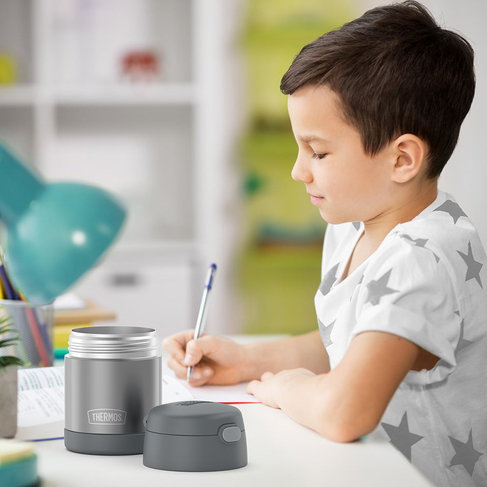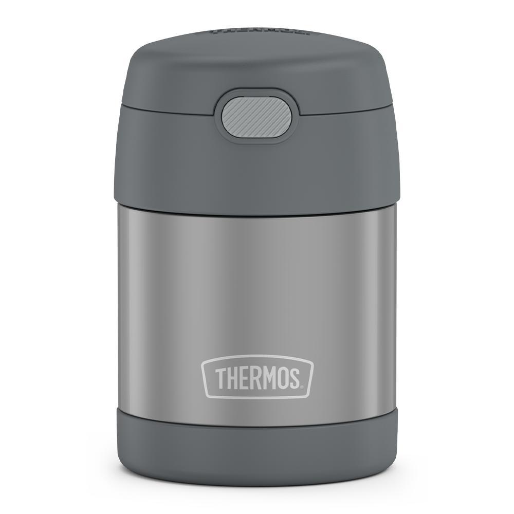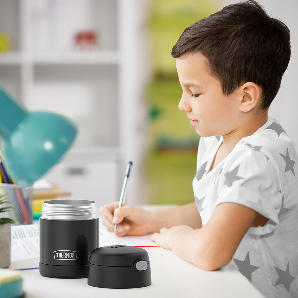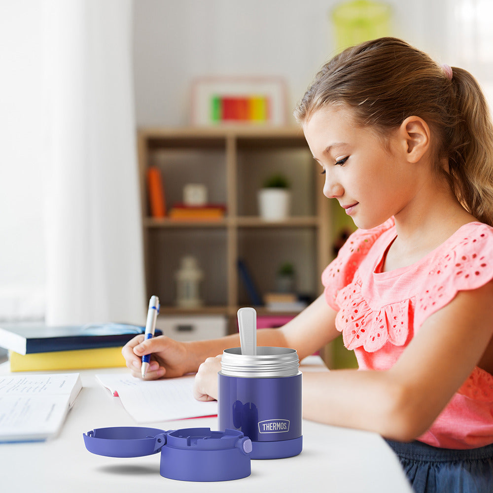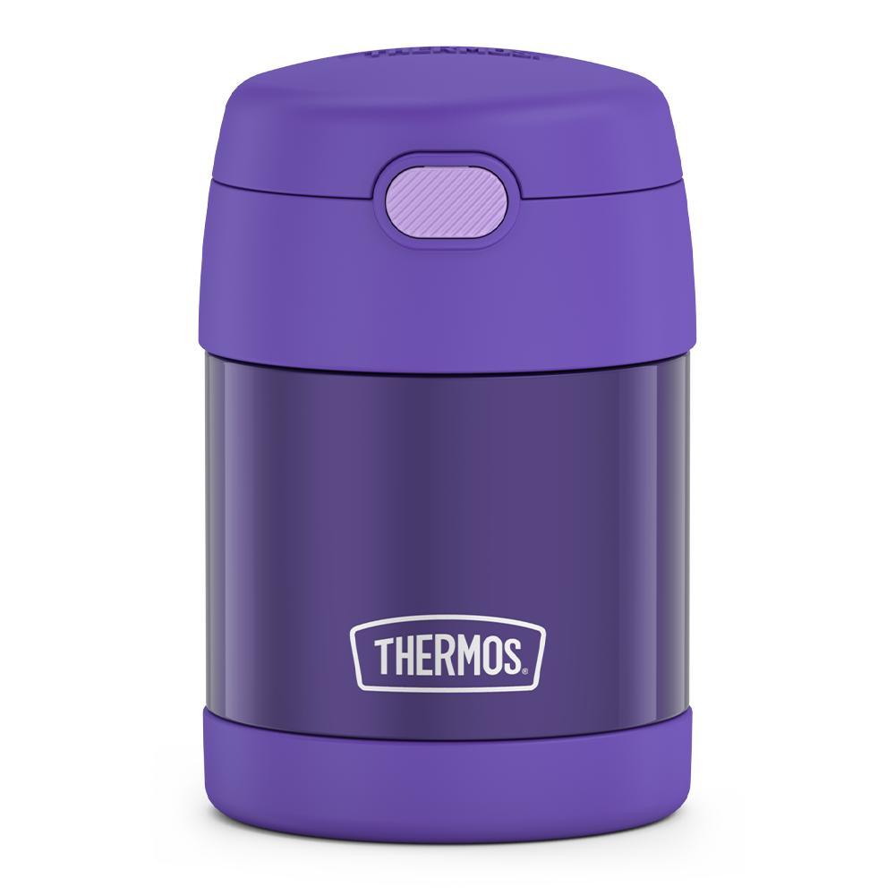 The 10oz FUNtainer? Food Jar from Thermos? brand is vacuum insulated to keep hot foods hot and cold foods cold-and since it’s designed for kids it’s also colorful and fun. Send them to school with their favorite soup so they can enjoy it fresh and hot at lunch time. If they’re in the mood for a cold snack. pack it up with yogurt and berries. or apples and peanut butter. The FUNtainer food jar is light weight and compact with a push button lid so it’s easy to carry and open. To clean. you can pop your FUNtainer food jar in the dishwasher; however washing by hand is recommended. Spoon included. Customize your FUNtainer food jar with adhesive name labels that can be firmly adhered to any FUNtainer product. Two peel and stick labels are included inside this FUNtainer product. Fun for the kids. and easy for the parents. Just write. peel and stick!