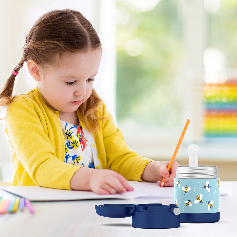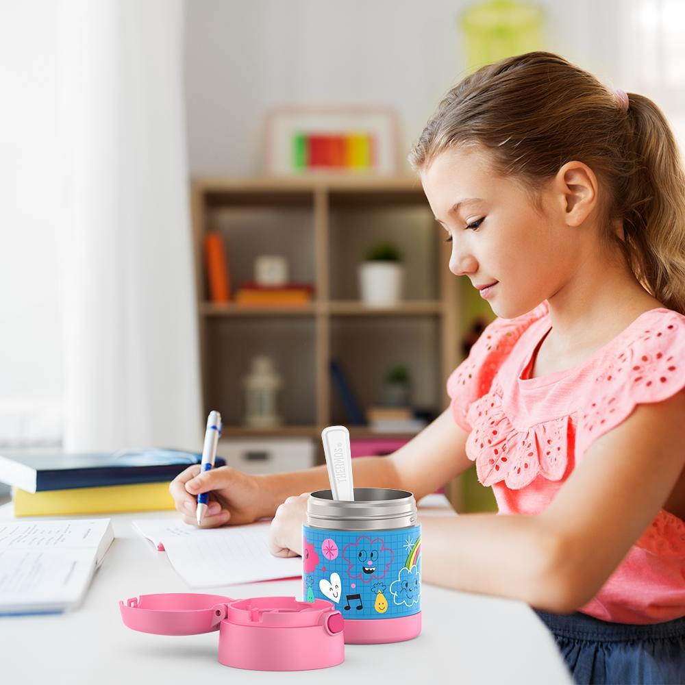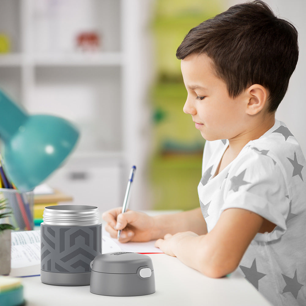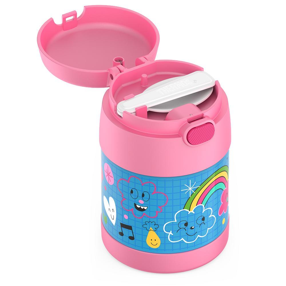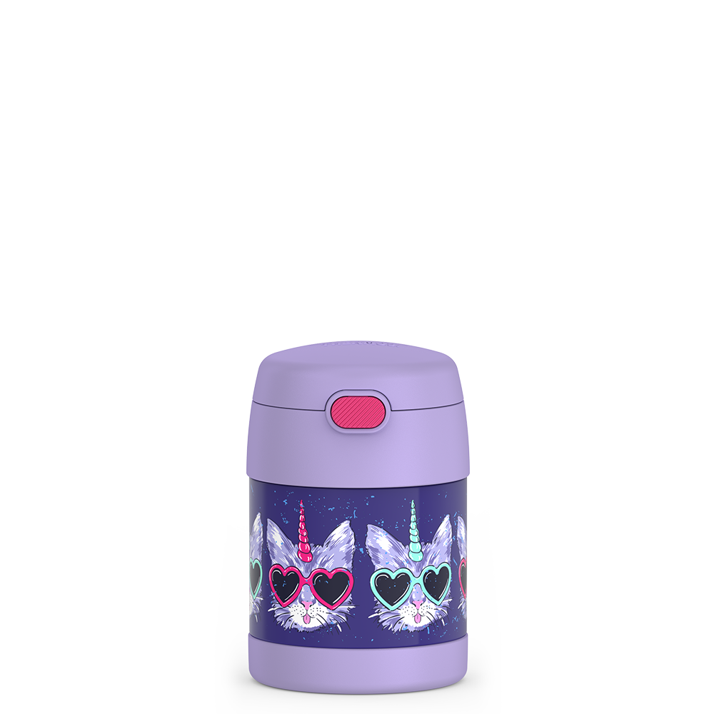 The 10oz FUNtainer® Food Jar from Thermos® brand is vacuum insulated to keep hot foods hot and cold foods cold-and since it’s designed for kids it’s also colorful and fun. Send them to school with their favorite soup so they can enjoy it fresh and hot at lunch time. If they’re in the mood for a cold snack. pack it up with yogurt and berries. or apples and peanut butter. The FUNtainer food jar is light weight and compact with a push button lid so it’s easy to carry and open. To clean. you can pop your FUNtainer food jar in the dishwasher; however washing by hand is recommended. Spoon included. Customize your FUNtainer food jar with adhesive name labels that can be firmly adhered to any FUNtainer product. Two peel and stick labels are included inside this FUNtainer product. Fun for the kids. and easy for the parents. Just write. peel and stick!