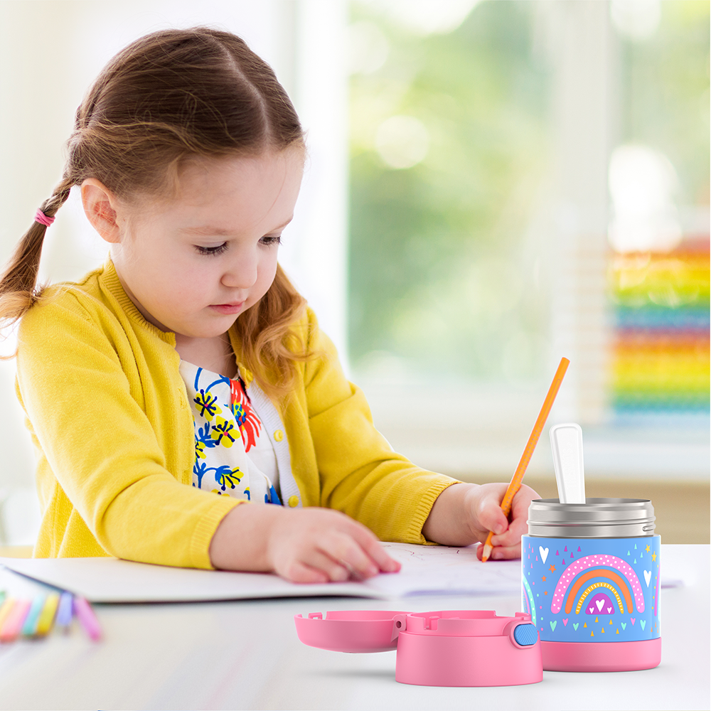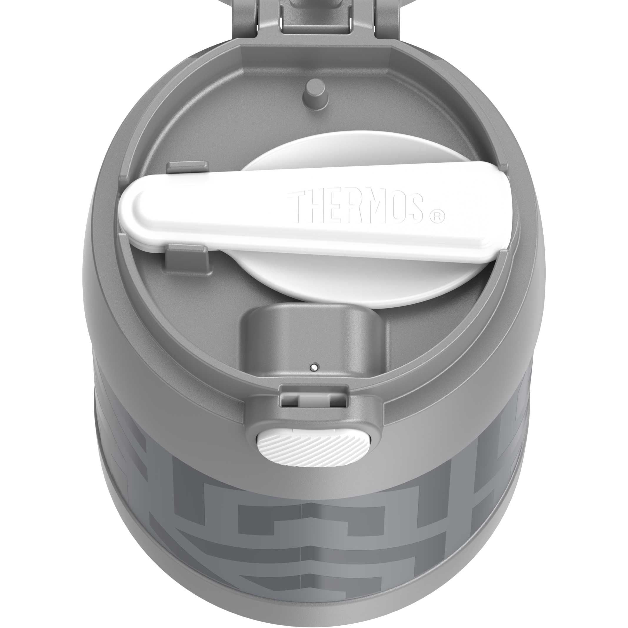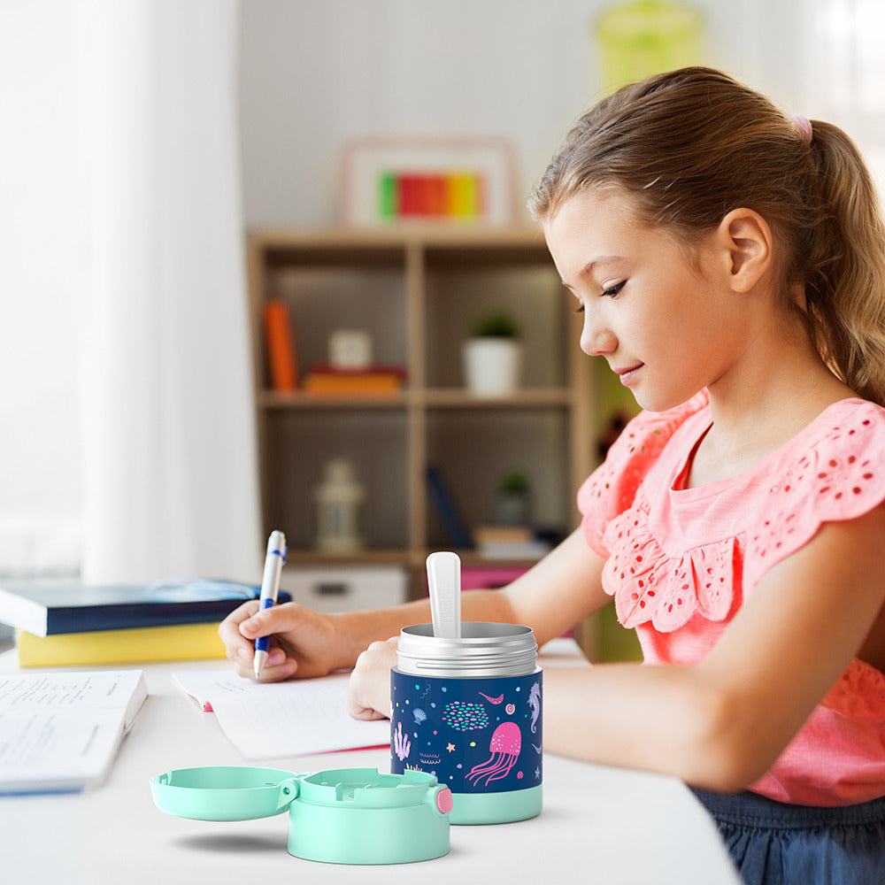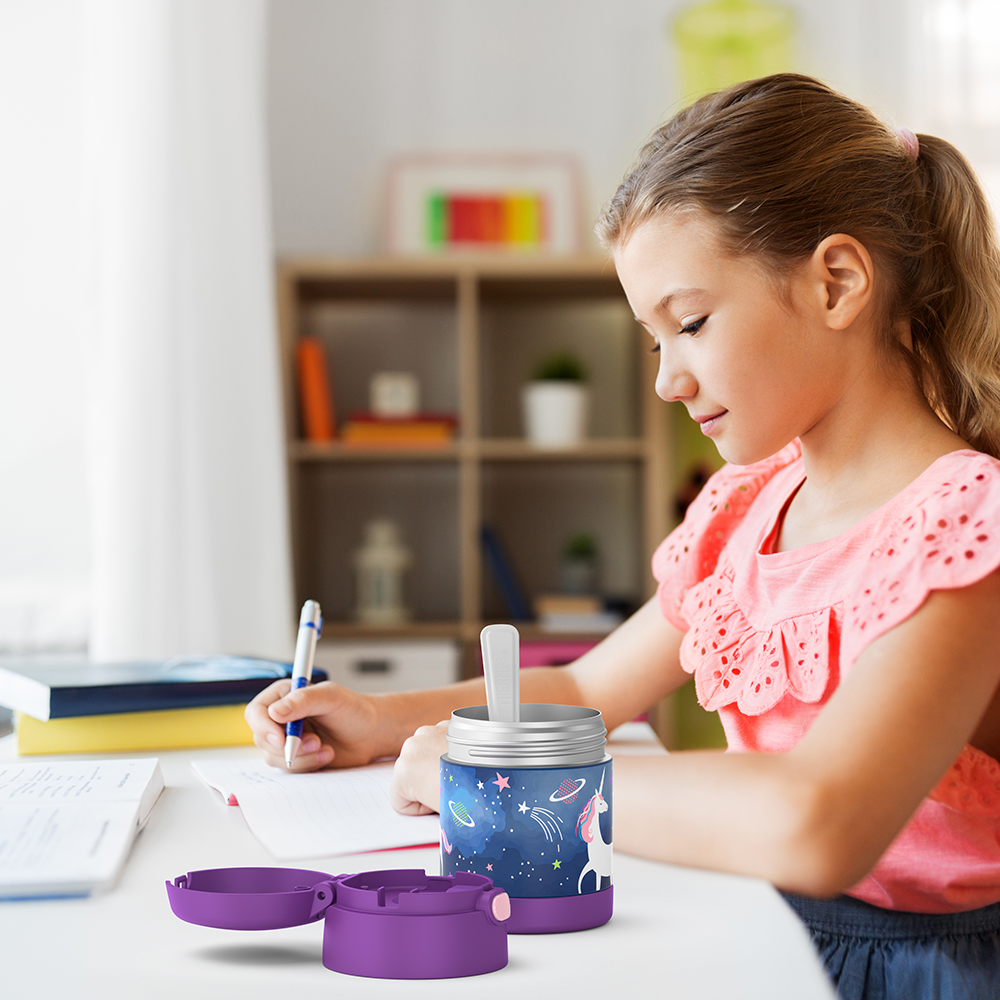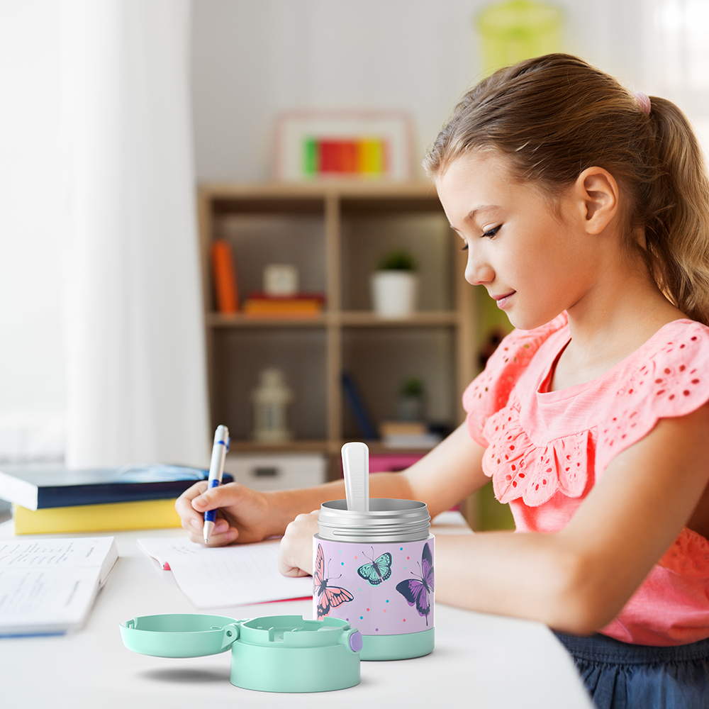 The 10oz FUNtainer® Food Jar from Thermos® brand is vacuum insulated to keep hot foods hot and cold foods cold-and since it’s designed for kids it’s also colorful and fun. Send them to school with their favorite soup so they can enjoy it fresh and hot at lunch time. If they’re in the mood for a cold snack. pack it up with yogurt and berries. or apples and peanut butter. The FUNtainer food jar is light weight and compact with a push button lid so it’s easy to carry and open. To clean. you can pop your FUNtainer food jar in the dishwasher; however washing by hand is recommended. Spoon included. Customize your FUNtainer food jar with adhesive name labels that can be firmly adhered to any FUNtainer product. Two peel and stick labels are included inside this FUNtainer product. Fun for the kids. and easy for the parents. Just write. peel and stick!