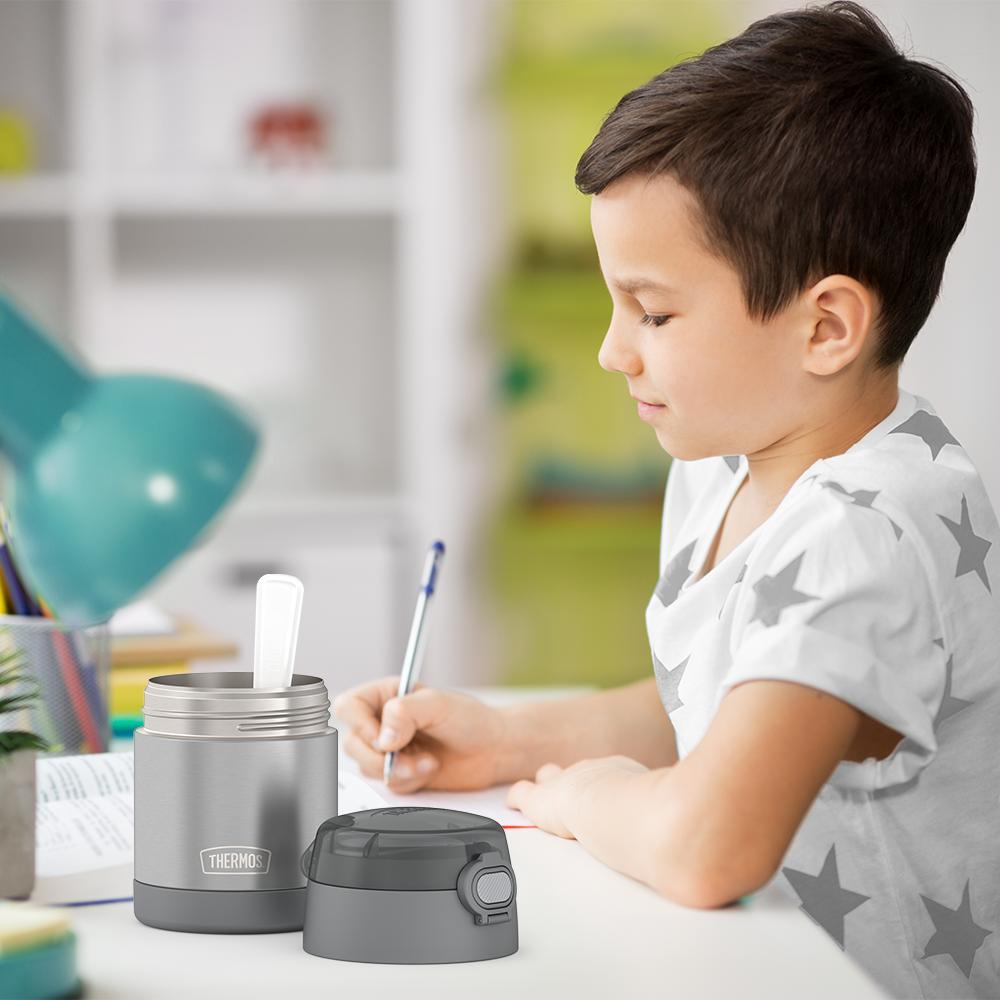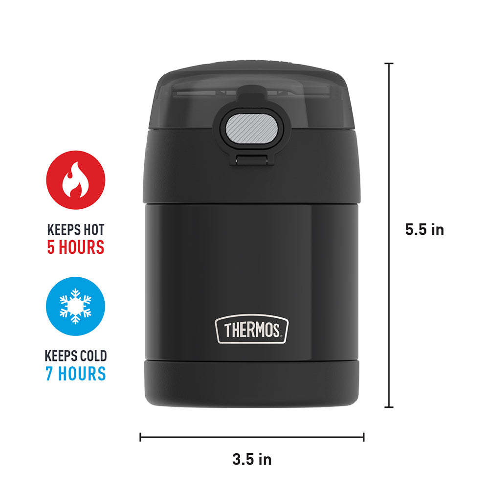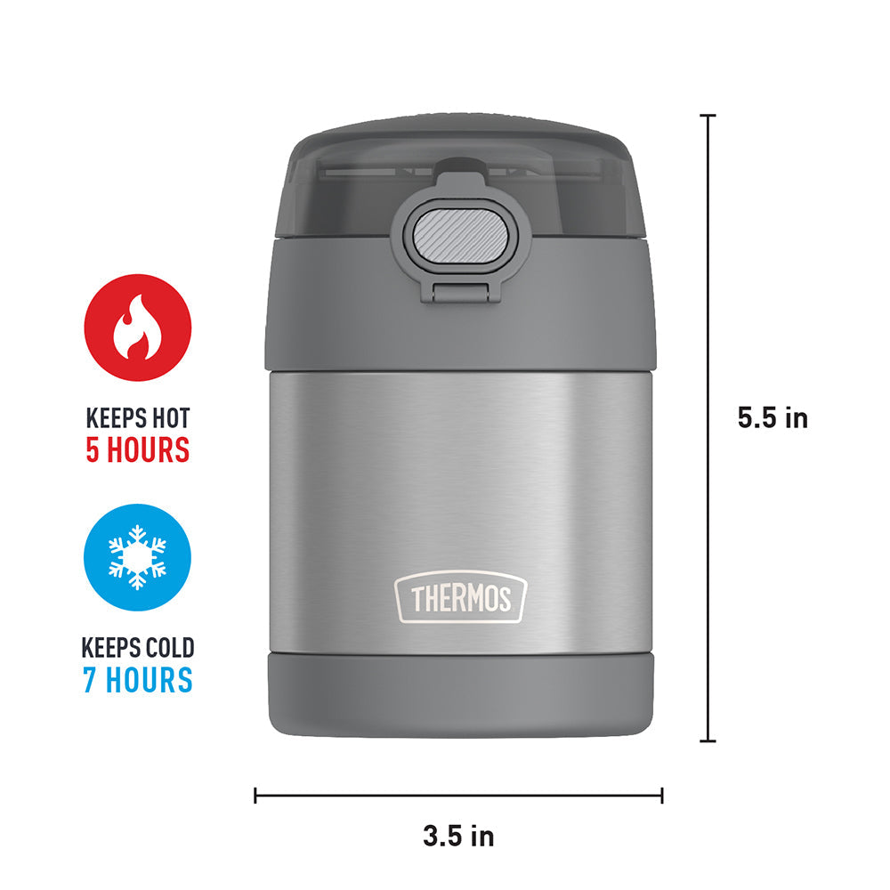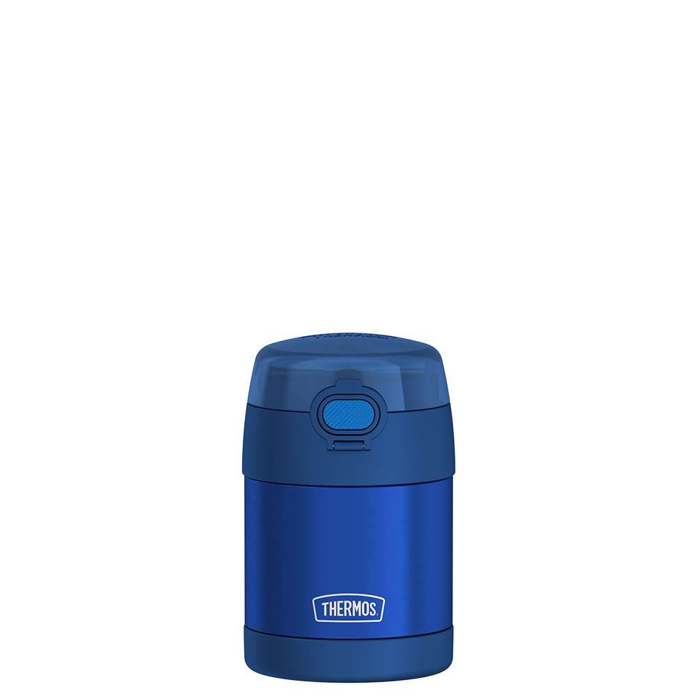 The 10oz FUNtainer? Food Jar with Snack Top from Thermos? brand is vacuum insulated to keep hot foods hot and cold foods cold-and since it’s designed for kids it’s also colorful and fun. Send them to school with their favorite soup so they can enjoy it fresh and hot at lunch time. If they’re in the mood for a cold snack. pack it up with yogurt and berries. or apples and peanut butter. The FUNtainer food jar is light weight and compact with a push button lid so it’s easy to carry and open. The clear top lid includes snack storage and a plastic folding spoon. Kids work hard and once lunchtime hits. they need the healthy stuff to power them through the rest of the day. This handy kids food container has a wide mouth. which lets them gobble and gulp their food right out of the bright-colored jar. To clean. you can pop your FUNtainer food jar in the dishwasher; however washing by hand is recommended.