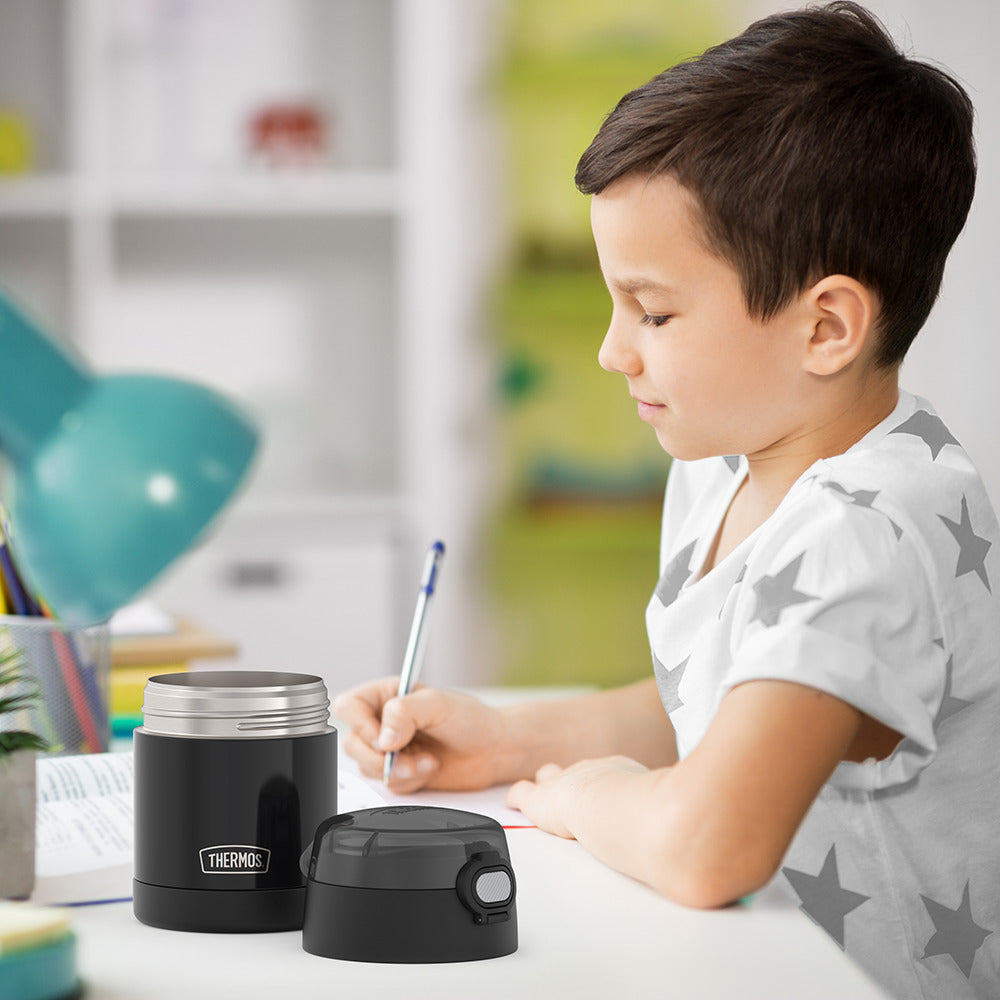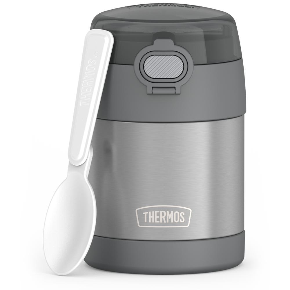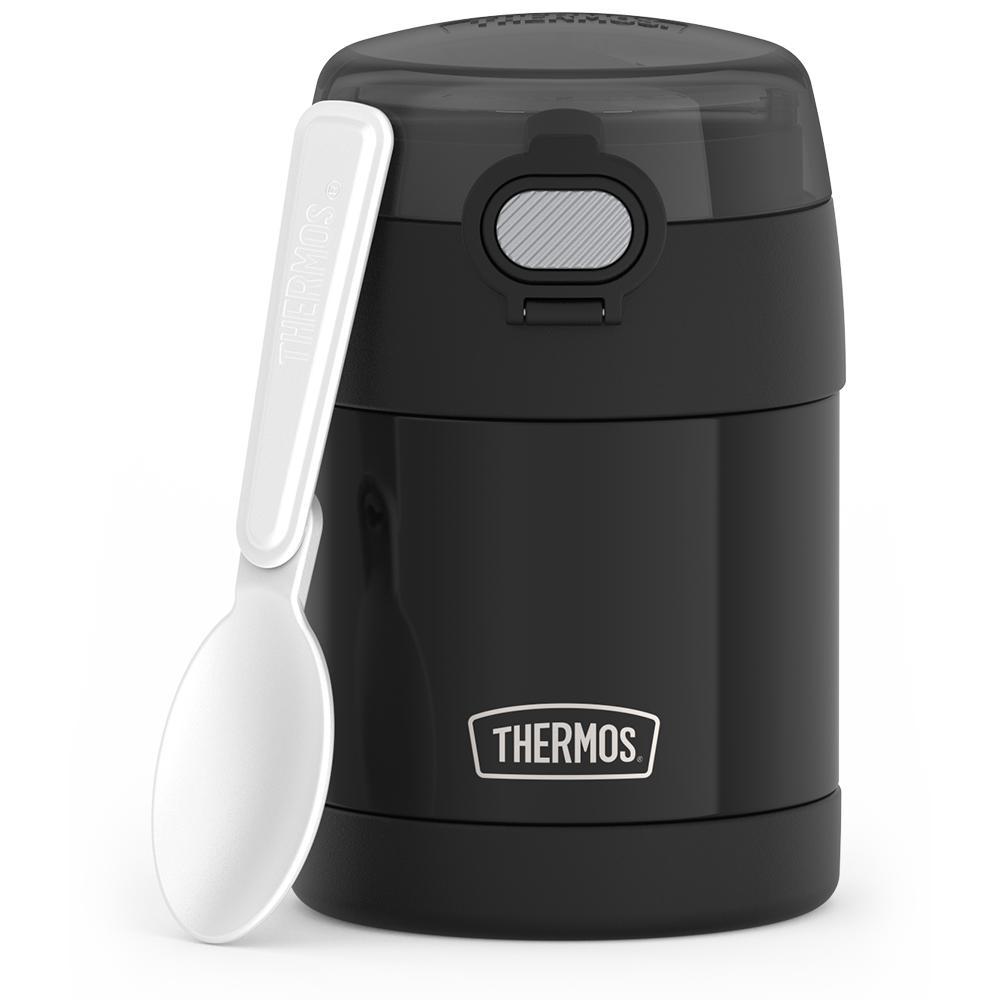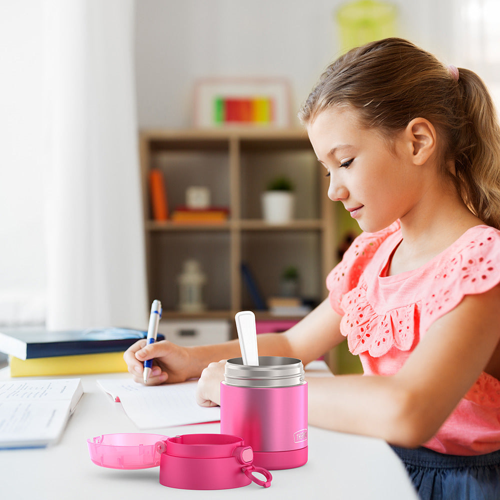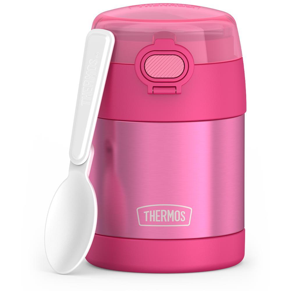 The 10oz FUNtainer? Food Jar with Snack Top from Thermos? brand is vacuum insulated to keep hot foods hot and cold foods cold-and since it’s designed for kids it’s also colorful and fun. Send them to school with their favorite soup so they can enjoy it fresh and hot at lunch time. If they’re in the mood for a cold snack. pack it up with yogurt and berries. or apples and peanut butter. The FUNtainer food jar is light weight and compact with a push button lid so it’s easy to carry and open. The clear top lid includes snack storage and a plastic folding spoon. Kids work hard and once lunchtime hits. they need the healthy stuff to power them through the rest of the day. This handy kids food container has a wide mouth. which lets them gobble and gulp their food right out of the bright-colored jar. To clean. you can pop your FUNtainer food jar in the dishwasher; however washing by hand is recommended.
