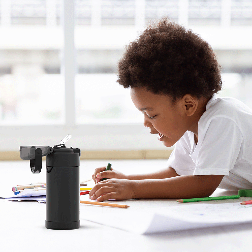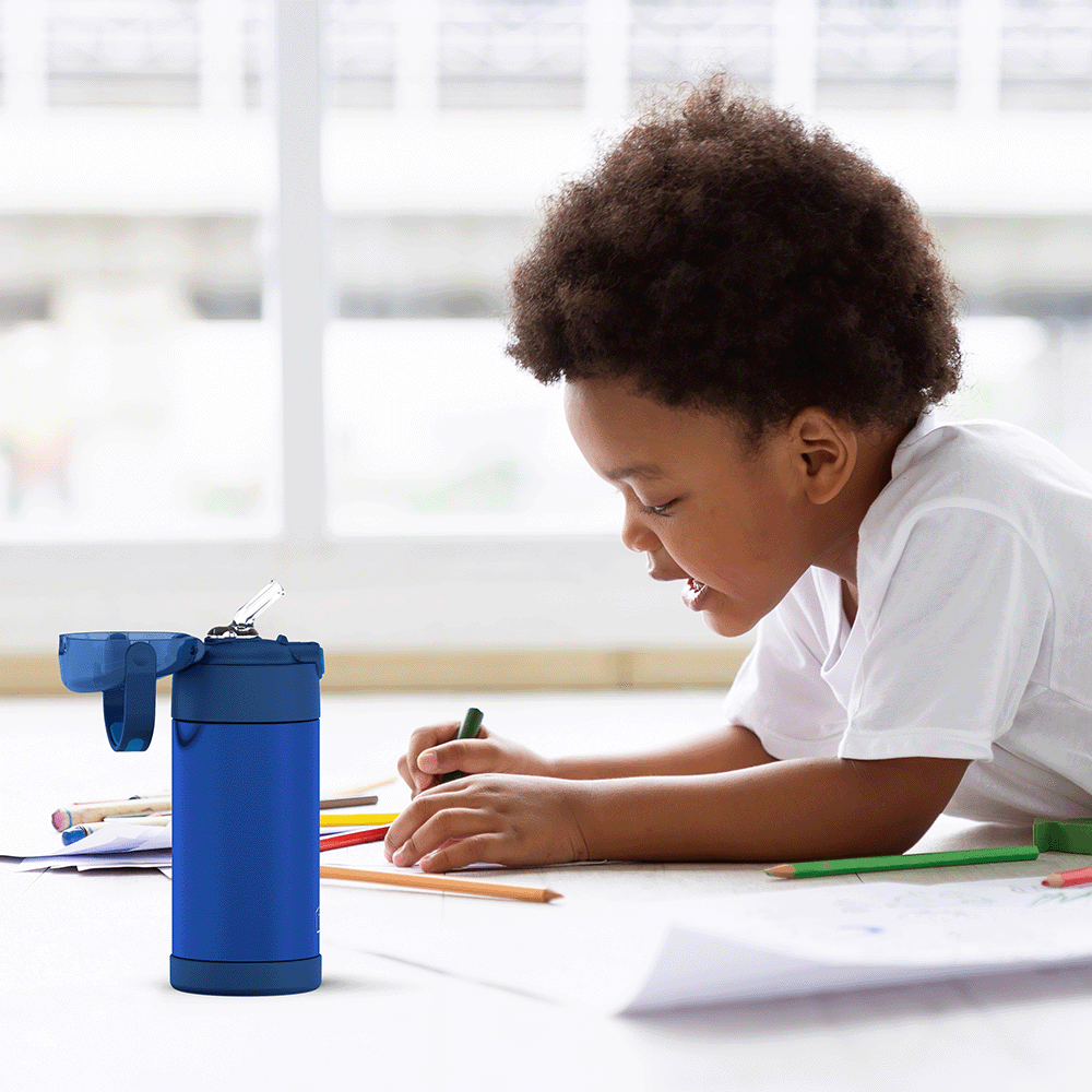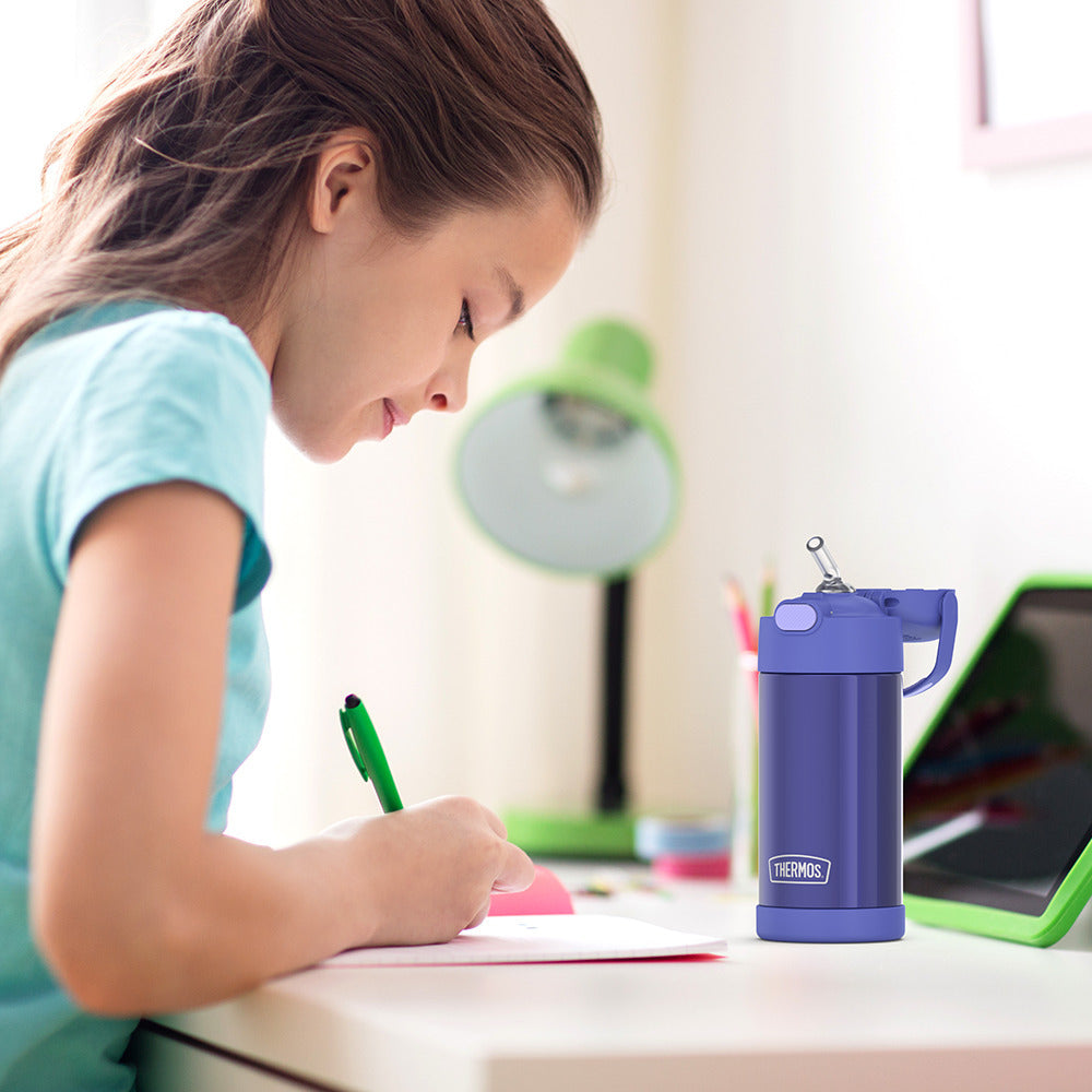 The FUNtainer? 12oz Vacuum Insulated Stainless Steel Water Bottle with Straw keeps drinks cold for up to 12 hours. The double wall stainless steel construction is built to handle drops. dings and assorted roughhousing. Includes an integrated carry handle with soft-touch grip. making it easy for kids to carry with them throughout the day. Help keep germs away with the hygienically covered silicone straw which is removable for easy cleaning. To clean. you can pop your FUNtainer water bottle in the dishwasher; however hand washing is recommended. Not for use with hot liquids. Label your FUNtainer bottle with adhesive name stickers that can be firmly adhered to any FUNtainer product. Two peel and stick labels are included inside this FUNtainer product. Fun for the kids. and easy for the parents. Just write. peel and stick!