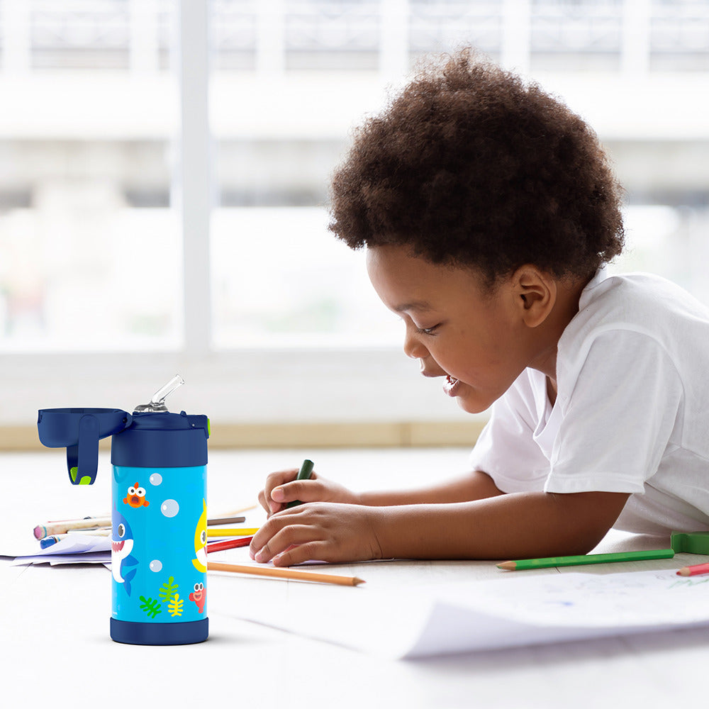 The FUNtainer® 12oz Vacuum Insulated Stainless Steel Water Bottle with Straw keeps drinks cold for up to 12 hours. The double wall stainless steel construction is built to handle drops. dings and assorted roughhousing. Includes an integrated carry handle with soft-touch grip. making it easy for kids to carry with them throughout the day. Help keep germs away with the hygienically covered silicone straw which is removable for easy cleaning. To clean. you can pop your FUNtainer water bottle in the dishwasher; however hand washing is recommended. Not for use with hot liquids. Label your FUNtainer bottle with adhesive name stickers that can be firmly adhered to any FUNtainer product. Two peel and stick labels are included inside this FUNtainer product. Fun for the kids. and easy for the parents. Just write. peel and stick!