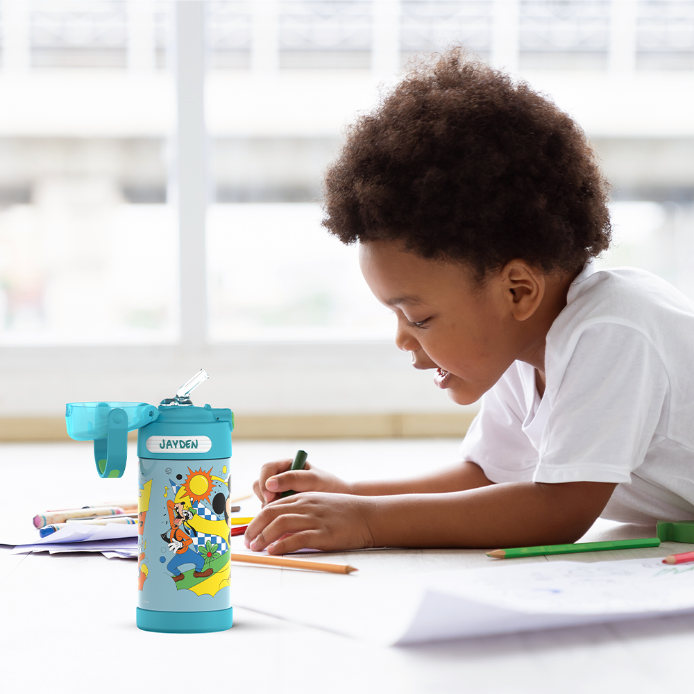 The FUNtainer? 12oz Vacuum Insulated Stainless Steel Water Bottle with Straw keeps drinks cold for up to 12 hours. The double wall stainless steel construction is built to handle drops. dings and assorted roughhousing. Includes an integrated carry handle with soft-touch grip. making it easy for kids to carry with them throughout the day. Help keep germs away with the hygienically covered silicone straw which is removable for easy cleaning. To clean. you can pop your FUNtainer water bottle in the dishwasher; however hand washing is recommended. Not for use with hot liquids. Customize your FUNtainer bottle with adhesive name labels that can be firmly adhered to any FUNtainer product. Two peel and stick labels are included inside this FUNtainer product. Fun for the kids. and easy for the parents. Just write. peel and stick!