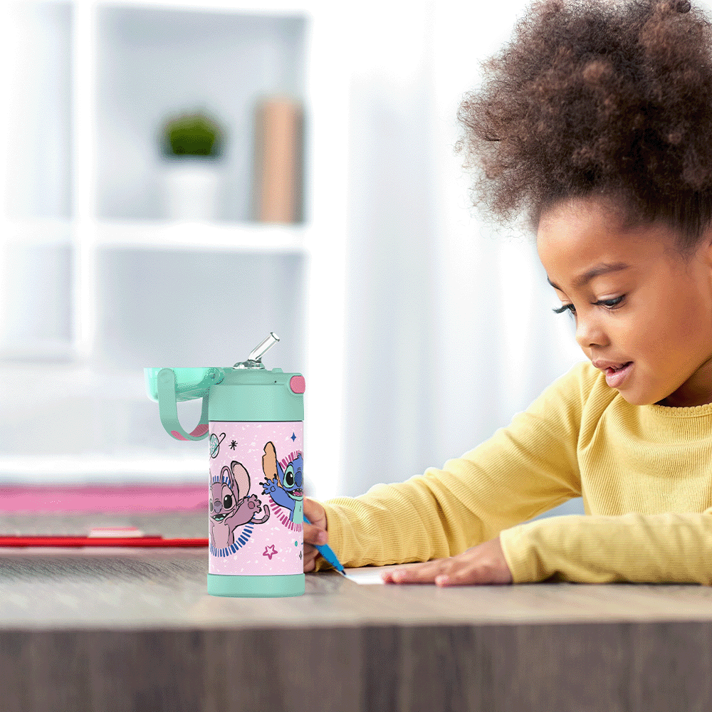 The FUNtainer? 12oz Vacuum Insulated Stainless Steel Water Bottle with Straw keeps drinks cold for up to 12 hours. The double wall stainless steel construction is built to handle drops. dings and assorted roughhousing. Includes an integrated carry handle with soft-touch grip. making it easy for kids to carry with them throughout the day. Help keep germs away with the hygienically covered silicone straw which is removable for easy cleaning. To clean. you can pop your FUNtainer water bottle in the dishwasher; however hand washing is recommended. Not for use with hot liquids. Label your FUNtainer bottle with adhesive name stickers that can be firmly adhered to any FUNtainer product. Two peel and stick labels are included inside this FUNtainer product. Fun for the kids. and easy for the parents. Just write. peel and stick!