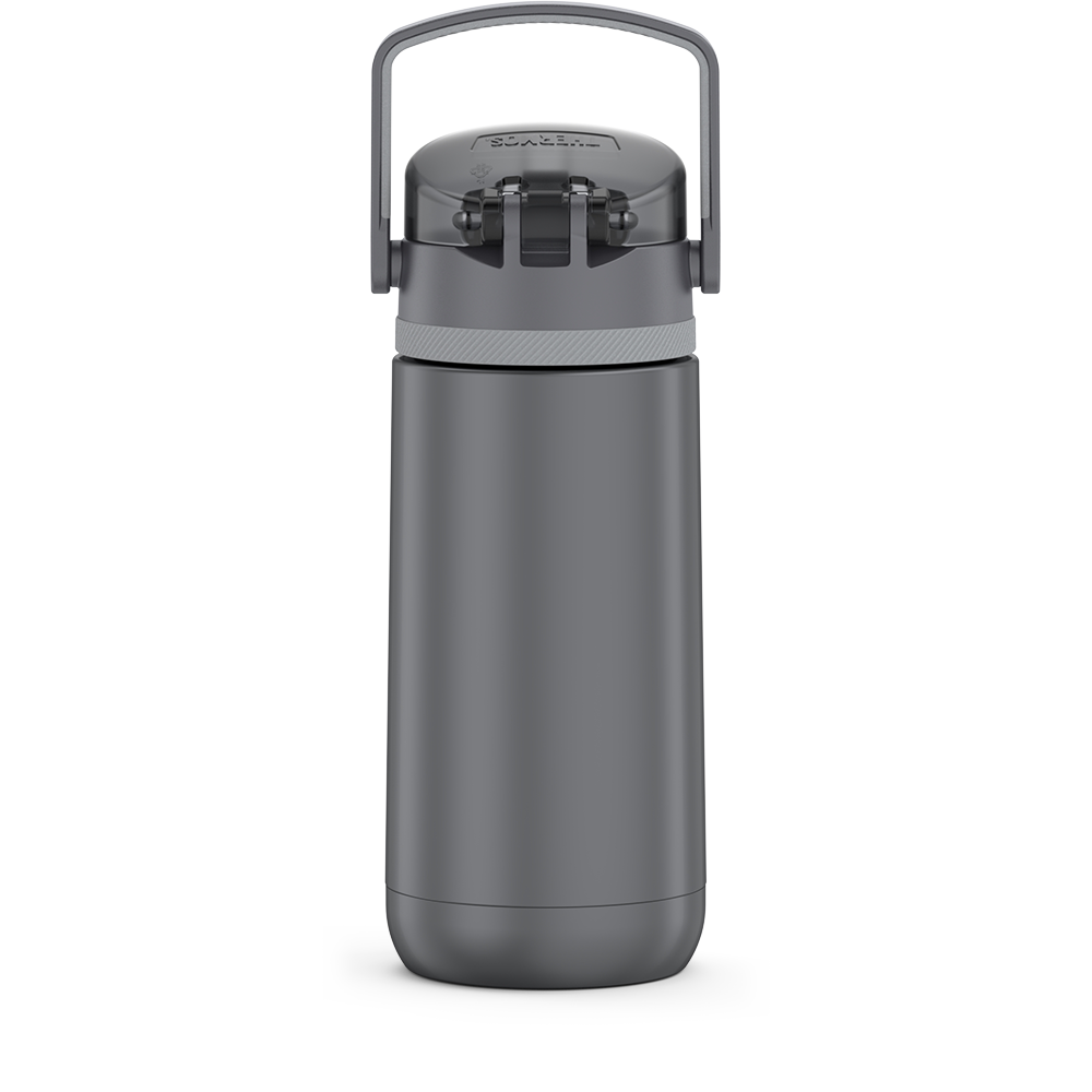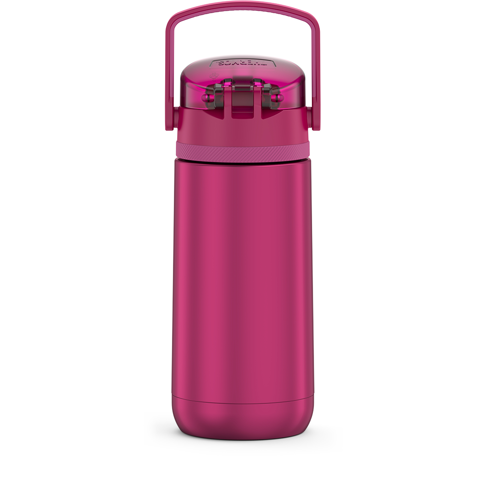 The 14oz Thermos? Kids Stainless Steel Water Bottle is ready to keep up on little adventures. Made with durable stainless steel. it’s designed to survive whatever your future explorer has in store. Equipped with Thermos? vacuum insulation technology to keep beverages cold for up to 14 hours. The sweat-proof design helps keep happy hands clean. Also equipped with a hygienic flip up covered straw to help keep germs away. The push button lid allows for easy one-handed opening. Ergonomically designed carry handle includes a soft touch grip that can be folded down when not in use. Dishwasher safe. Not for hot liquids.